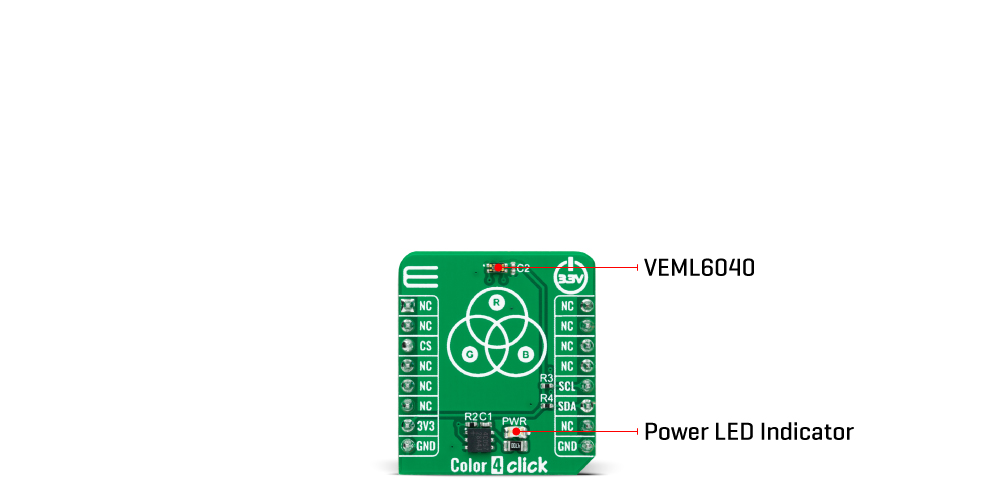 Color 4 Click is based on the VEML6040, an advanced RGB/ambient light sensor from Vishay Semiconductors, that provides fast and accurate spectral measurements. It is based on the Filtron™ technology achieving the closest ambient light spectral sensitivity to real-human eye responses. The VEML6040 senses red, green, blue, and white light and processes those signals using a CMOS signal conditioning circuit. This digital RGBW information can be used in feedback control systems, among other things, to monitor and actively control a light source.